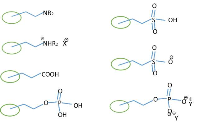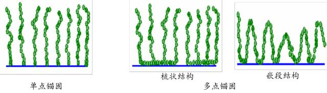 超分散劑的結(jié)構(gòu)。分子結(jié)構(gòu)按其具有的性質(zhì)和功能可分為兩部分:一部分為錨固基團:如-NR2、-NR3+、-COOH、-SO3H、-PO4H2、-SO3-、-PO42-、多元胺、多元醇及聚醚等(如圖),它通過離子鍵、共價鍵、氫鍵及范德華力等作用形式緊緊地吸附于顆粒表面,不易脫附,錨固段在整個超分散劑分子結(jié)構(gòu)中所占比例很小,一般占10